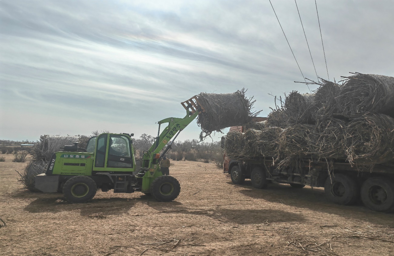 在苏尼特右旗,牧民们正紧锣密鼓地赶制着稻草帘和网围栏等治沙物料。陶高图畜产品运营专业协作社内,十几台草帘编织机和主动卷帘机开足马力作业,一张张稻草帘在牧民们的手中诞生,它们将被用于沙地的管理与植被康复。而牧民之友网围栏加工厂则分秒必争地赶工期、抓进展,一条条钢丝在机器的牵引下被编织成严密的网围栏,将为沙地筑起了一道道绿色的屏障。